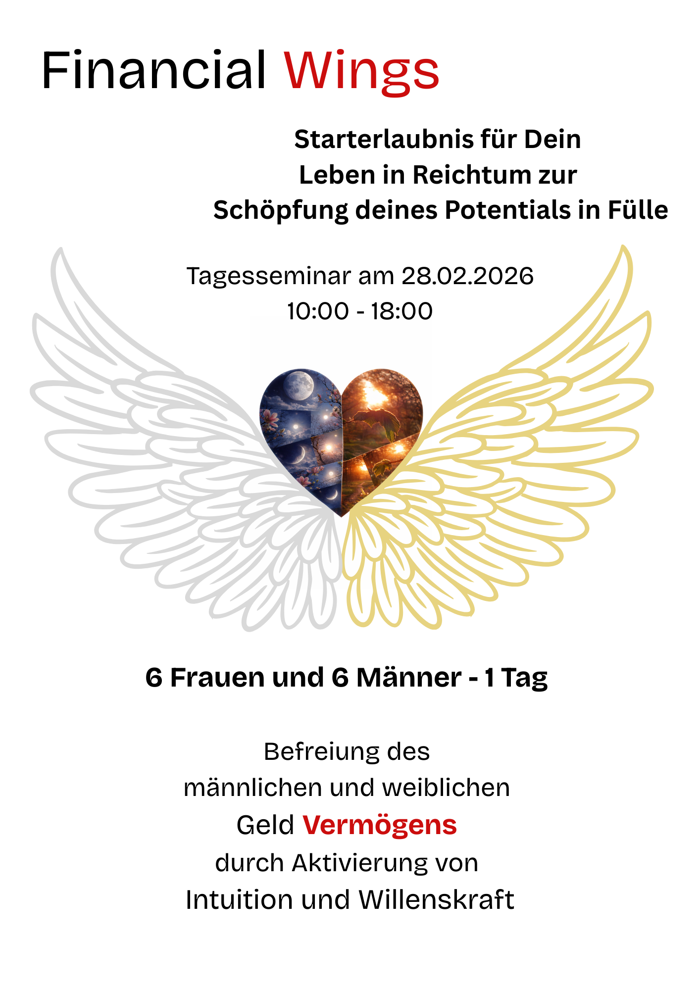 Financial Wings – frei Übersetzt finanzielle Flügel ist das Auftaktseminar für ein Reihe weiterer Seminare, die sich mit der Freisetzung des ganz eigenen Potentials beschäftigen wird.